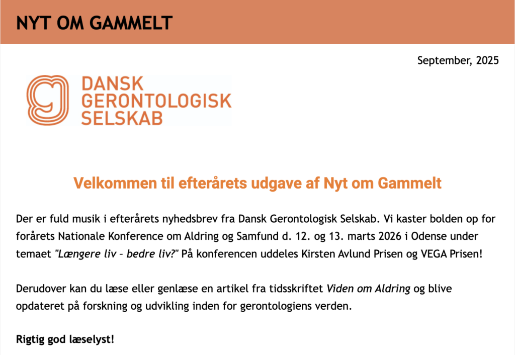 Modtag selskabets nyhedsbrev, Nyt om Gammelt, og andre nyheder af gerontologisk relevans, fx fyraftensmøder, konferencer og nye udgivelser, fire gange årligt.